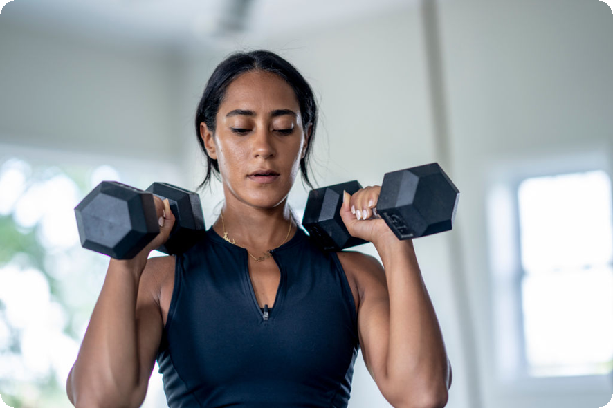 "덤벨 운동이 다양한 근육 그룹을 자극함으로써 전반적인 상체 균형을 유지하는 데 도움을 줍니다."