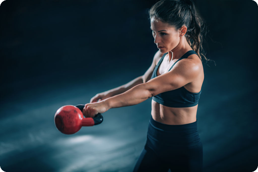 - 엉덩이와 햄스트링의 힘을 이용해 케틀벨을 강하게 들어 올립니다."팔 힘이 아닌 엉덩이와 햄스트링의 힘으로 들기."